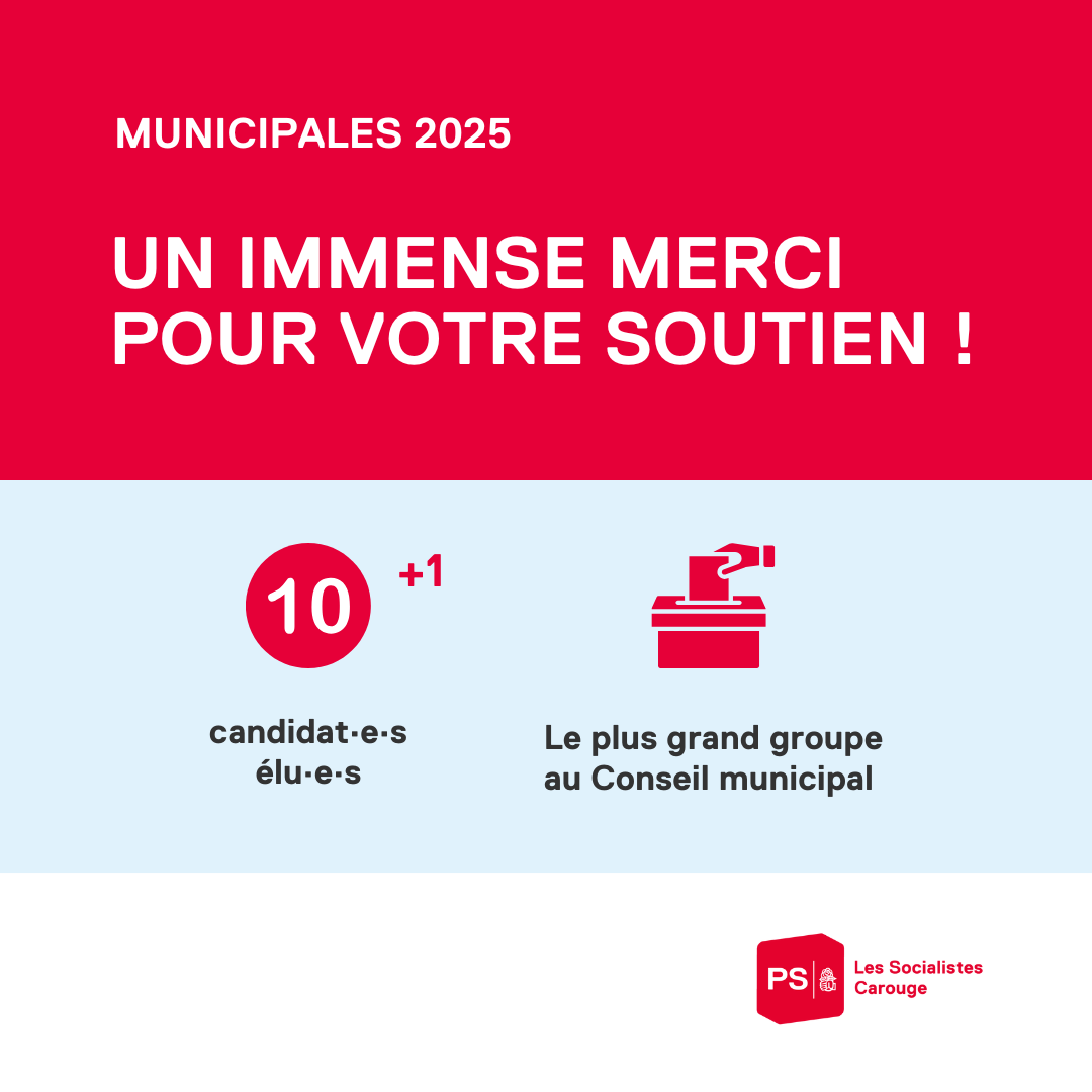 Grâce à la confiance des Carougeoises et des Carougeois, le PS Carouge gagne un siège et devient le plus grand groupe du Conseil municipal, avec 10 élu·e·s engagé·e·s à vos côtés pour les cinq prochaines années.